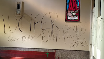 Em uma das paredes foi pichado a frase “que o diabo tenha pena de vocês”. Em outra, a frase “o diabo manda aqui”. Também foram pichadas ameaças ao padre, que foi à Delegacia de Russas registrar um boletim de ocorrência nesta manhã. Estátuas de santos também foram danificadas.
