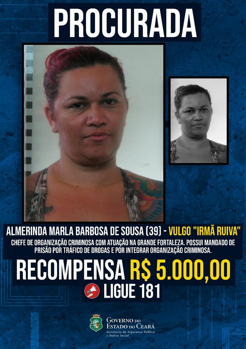 A Secretaria da Segurança Pública (SSPDS) afirmou que “Irmã Ruiva” possui mandados de prisão por tráfico de drogas e por integrar uma organização criminosa. Ela estava foragida e era oferecido um valor de R$ 5 mil por informações que ajudassem na sua captura.