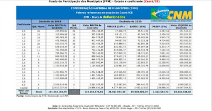 As prefeituras das 184 cidades do Ceará recebem, nesta segunda-feira (30), um total bruto de R$ 132.255.371,96 como terceira parcela do Fundo de Participação dos Municípios (FPM) no mês de novembro. O menor valor individual (R$ 236.743,95) é destinado aos municípios com coeficiente 0.6, ou seja, com menos habitantes. São 20 cidades no Ceará que estão enquadrados nesse perfil.