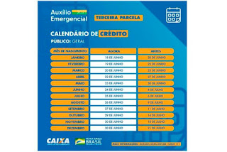 A Caixa Econômica Federal anunciou que vai antecipar os pagamentos da terceira parcela do auxílio emergencial. O novo calendário tem início no dia 18 de junho, com os depósitos para os nascidos em janeiro, e vai até o dia 19 de julho para os nascidos em dezembro.